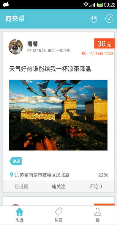 “俺来帮”是一个找附近的人帮忙解决问题的应用,本地用户互帮互助同时还可以赚钱。
