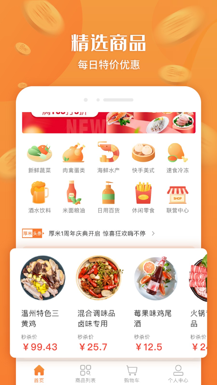 厚米app是一款可以直接购物生鲜的优惠软件,每天都会提供一些精选的商品在软件上面,给大家非常真实的优惠价格,在这里购买平常需要的生鲜蔬菜以及各种配料,可以帮助提高自己的厨艺,看到非常丰富的食谱和配料,让自己能更加享受生活。