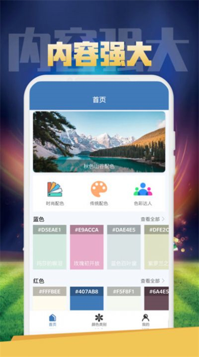 主题推荐:app可以根据场景或目的,帮助用户快速找到最合适的色彩组合。
