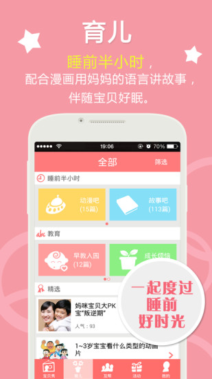 睡前半小时,故事吧,漫画吧,一段小文字伴宝贝好眠;早教入园,精心的学前准备才能好学向上;成长烦恼,跟着宝贝一起成长;优雅舌尖,精致讲究的美味食谱。