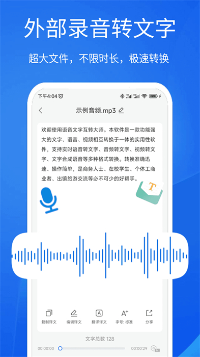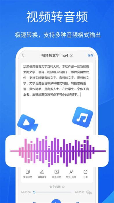 语音文字互转大师软件是一款非常实用的多功能语音文字转换app,它能够将你的语音快速转换成文字,或者将文字转换成语音,拥有了这款app能够使你在与他人交流时更加方便,我们能用语音记录想法、备忘录或者发送信息,也可以将接收到的语音消息转换为文字以便阅读,同时,软件支持多种语言互转,这使得我们不论在何时何地都能与全球友人进行无障碍交流。