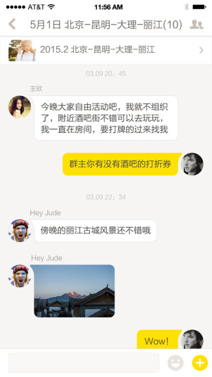 用户可以和自己感兴趣的人私聊,也可以加入与自己有共同旅行目的地的约伴进行群聊。