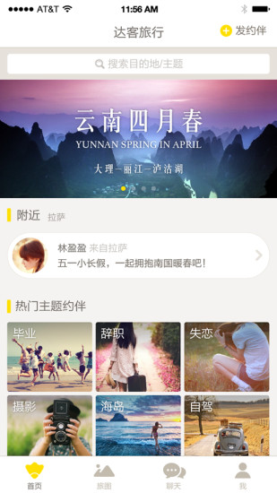 达客旅行是一款社交旅行APP,旨在为热爱旅行的年轻人提供一个安全、有趣的线上约伴平台,满足年轻用户旅行时对同“道”中人和个性化路线的需求。