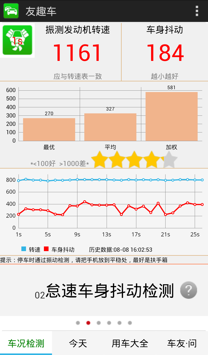 友趣车,是一款汽车驾驶检测软件,它通过声音、手机传感器检测您爱车车况,为车主用户提供了怠速、车身抖动、异响、车漂、顿挫刹车等5种神奇的车况检测功能。