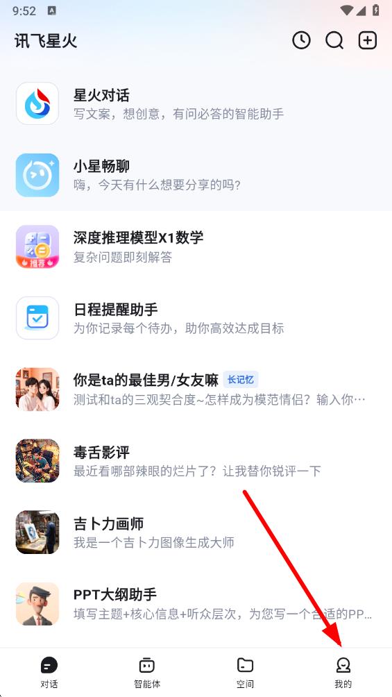 1、打开讯飞星火app,点击底部导航栏最右侧的我的选项,进入个人界面。