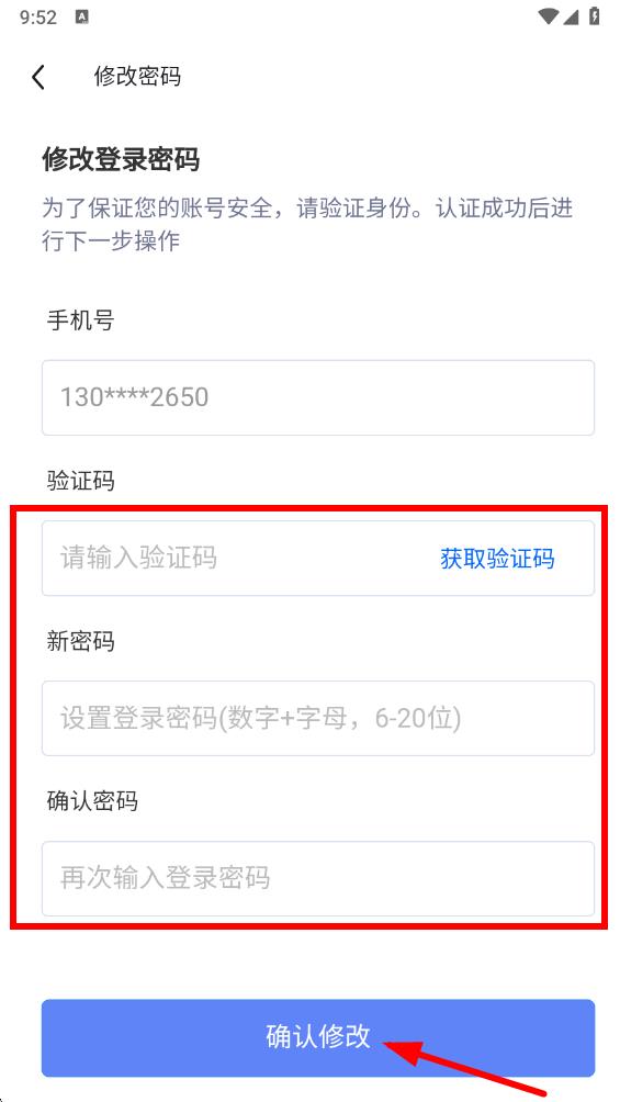 5、在页面点击获取验证码,再设置新密码并确认密码,最后点击确认修改,即可完成密码修改。