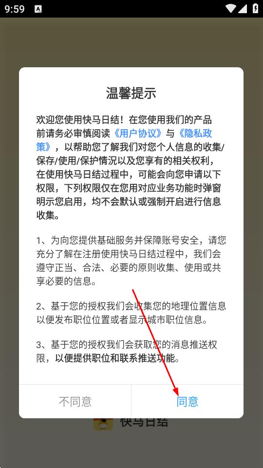 1、打开快马日结APP,在弹出的温馨提示页面,点击同意。
