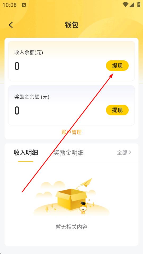 4、在钱包页面,点击收入余额右侧的提现按钮即可。