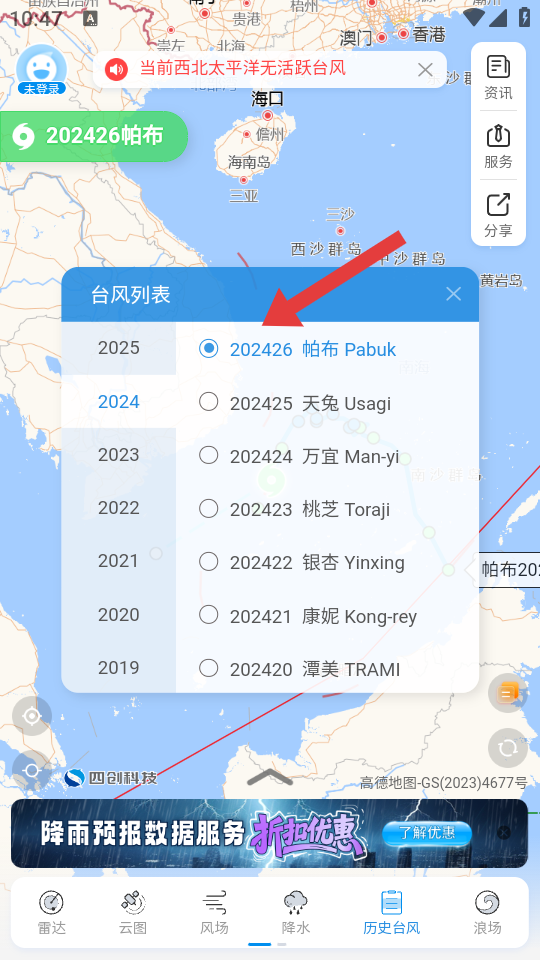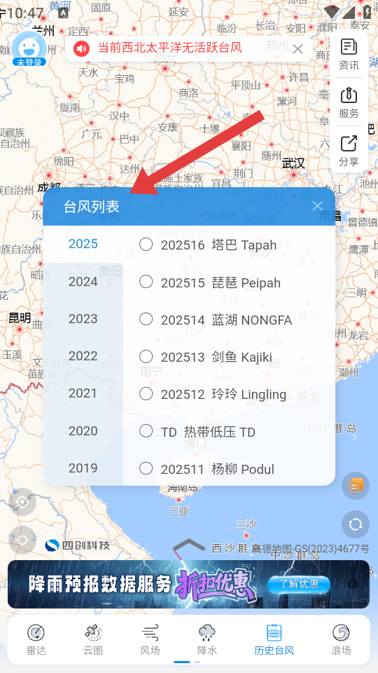 1、在实时台风路径的主界面,点击底部历史台风选项,弹出台风列表弹窗。