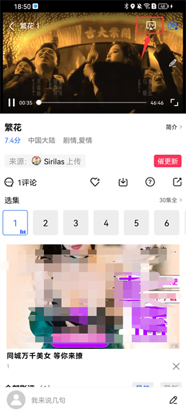 2、点击影片进入播放页面,需要再次点击一下播放屏幕,就会出现进度条,点击上方的“TV”标志,就是我们的投屏按钮;