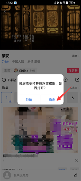 3、注意,投屏需要打开悬浮窗权限,这离我们需要点击确定即可;