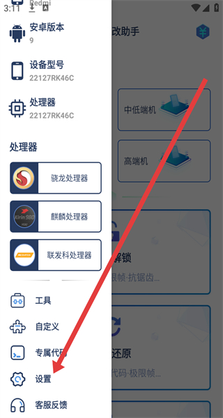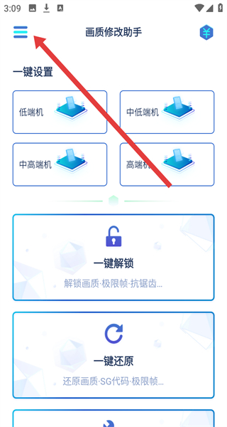 1、在画质修改助手首页点击左上角菜单按钮,展开侧边栏菜单。
