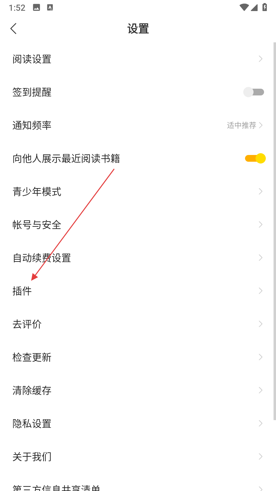 3、在设置界面里,找到插件选项并点击,进入插件列表页面。