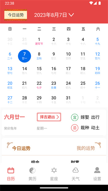 太和万年历软件是一款包含了日历查询以及星座等参考的软件,可以直接在这里了解到最新运势,当天就能看到详细的信息,以及各种黄历注意地方,大家能查看更多关于农历、日期方面的数据,享受软件带来的生活便利,每个星座下还有详细的黄历功能,每个日期都记录的非常清晰。