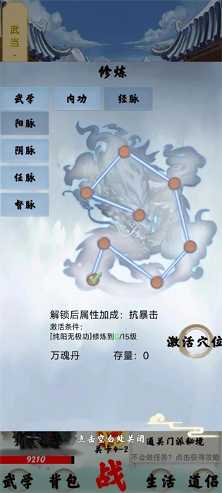 2.通过参加门派内的任务、挑战其他门派或完成江湖任务,可以获得更高级的武学功法。