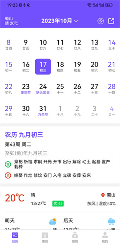 2、全面的黄历信息,包括宜忌、农历节气等内容,以及黄道吉日;