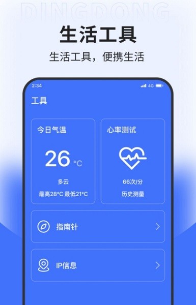 2、常用工具,一键获取当前城市的天气状况,随时关注心率指标;