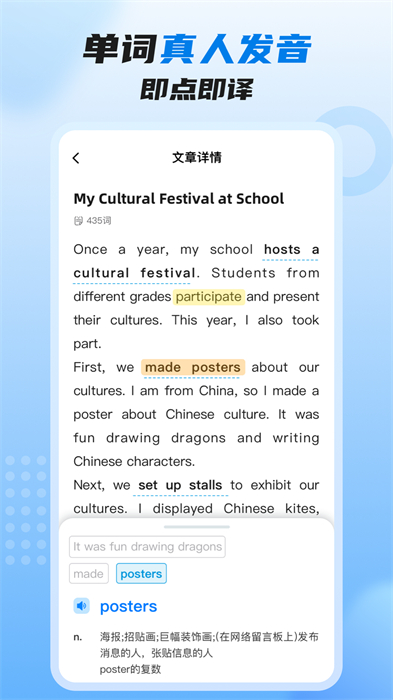 2、每天会推送一份定制的英语学习资料,以便用户每天都能坚持学习。