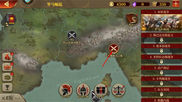 3、在罗马崛起的地图界面,选择对应的战役关卡,准备进入该战役的战斗环节。