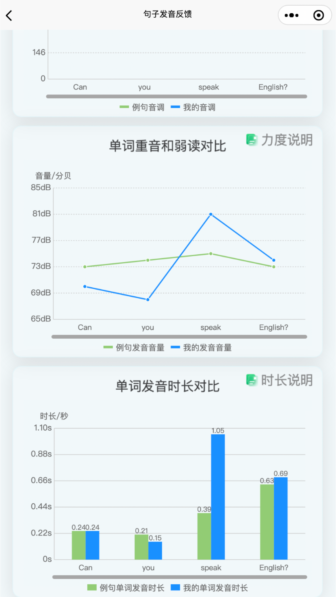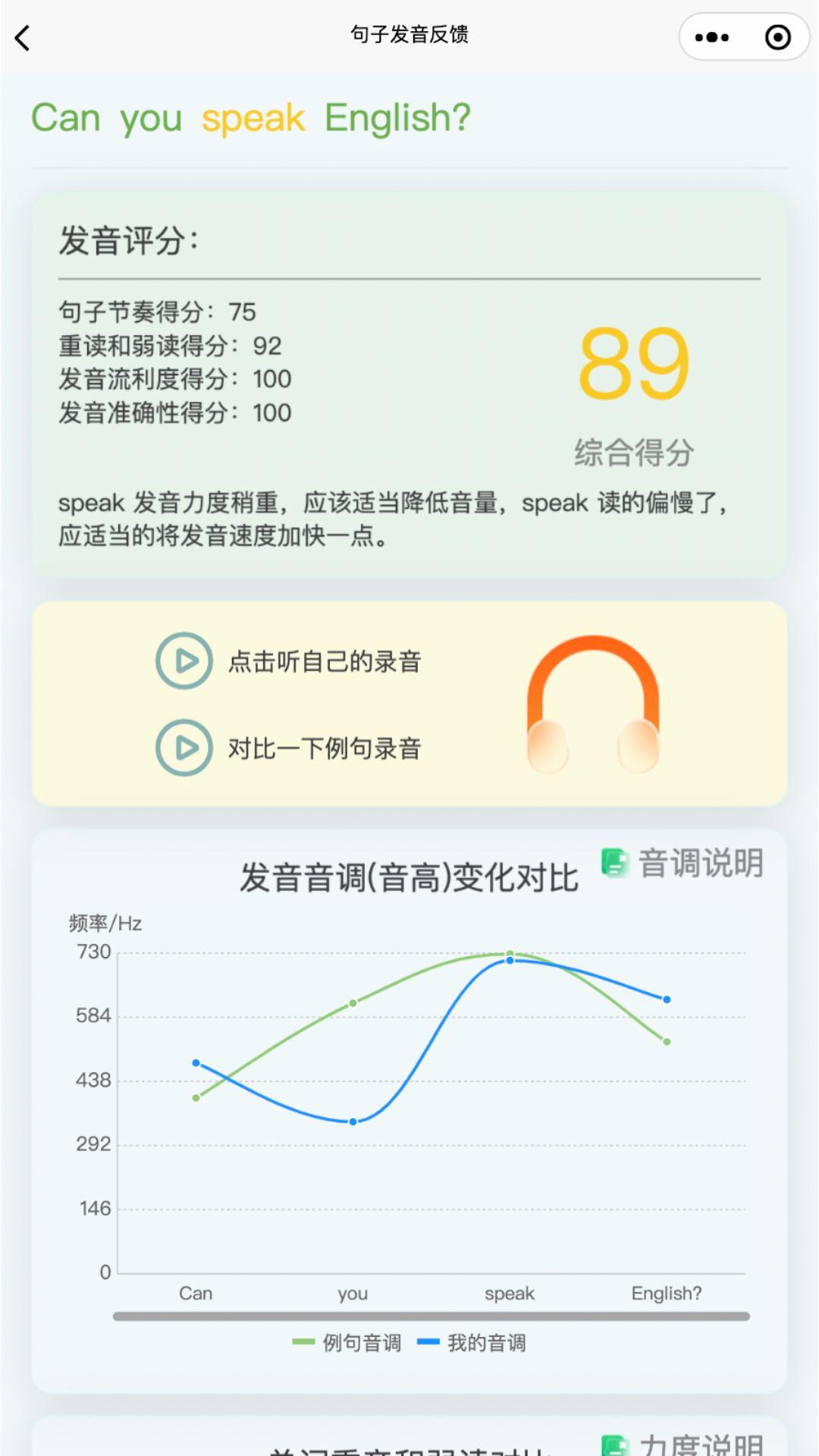 【口语发音纠正】本软件可以从节奏,语音语调,重读和弱读,流利度和发音准确性等多方面给您的口语打分,让您充分了解自己英语口语的不足的地方,可以有目标的练习!