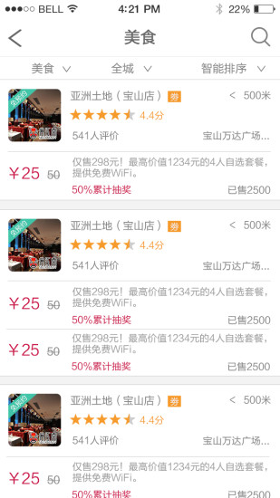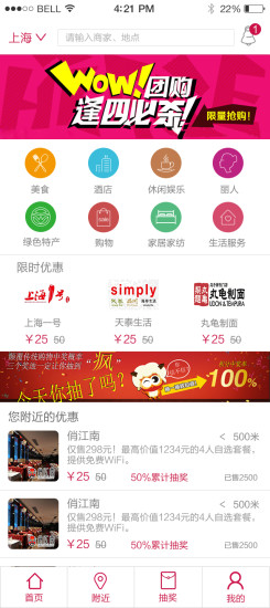 4、快速启动登录,通过GPS定位搜索周边热门吃喝玩乐实体店。