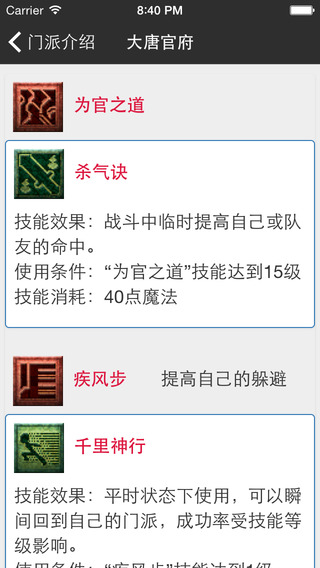 门派介绍:门派技能,每日人物,装备特技,法宝、阵法等进行查看