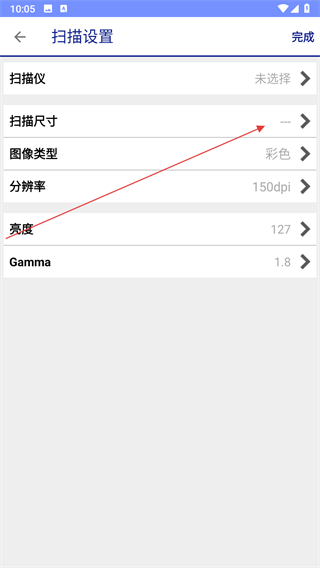 3、在扫描设置页面中,点击扫描尺寸选项,进入扫描尺寸选择界面。