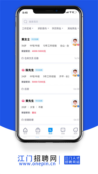 江门招聘网app是一款专业的求职软件,根据的用户不同需要,筛选和推荐相关岗位,用户可以在首页中查看最新发布的岗位信息,包括薪资、地区、工作内容等,可以直接联系相关岗位的招聘者进行沟通,同时可以进行个人信息和简历的完善,通过填写你的意向岗位和薪资,让软件更好的向你推荐相关信息,对于招聘者来说,通过招聘信息与相关专业人才进行匹配,让用户更快更精确的找到对应应聘者。