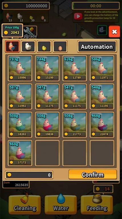 2、游戏中有各种类型的鸡仔可以选择,比如老母鸡、紫鸡、黑鸡等等,各种品质数不胜数,品种越好价格越高;
