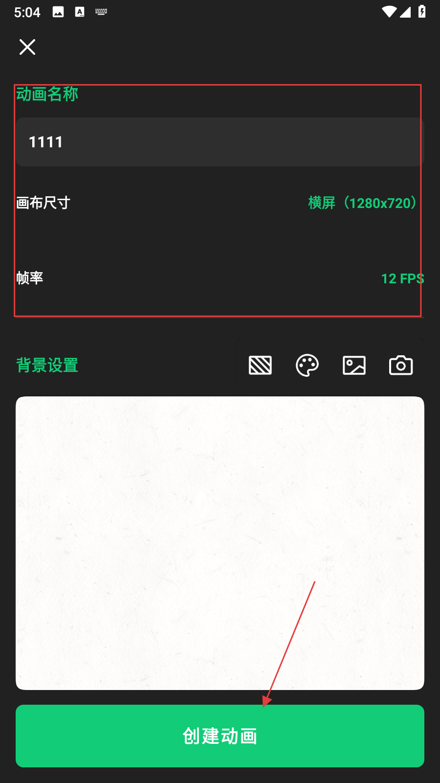 2、在动画创建页面,设置动画名称、画布尺寸、帧率以及背景,设置完成后点击创建动画。