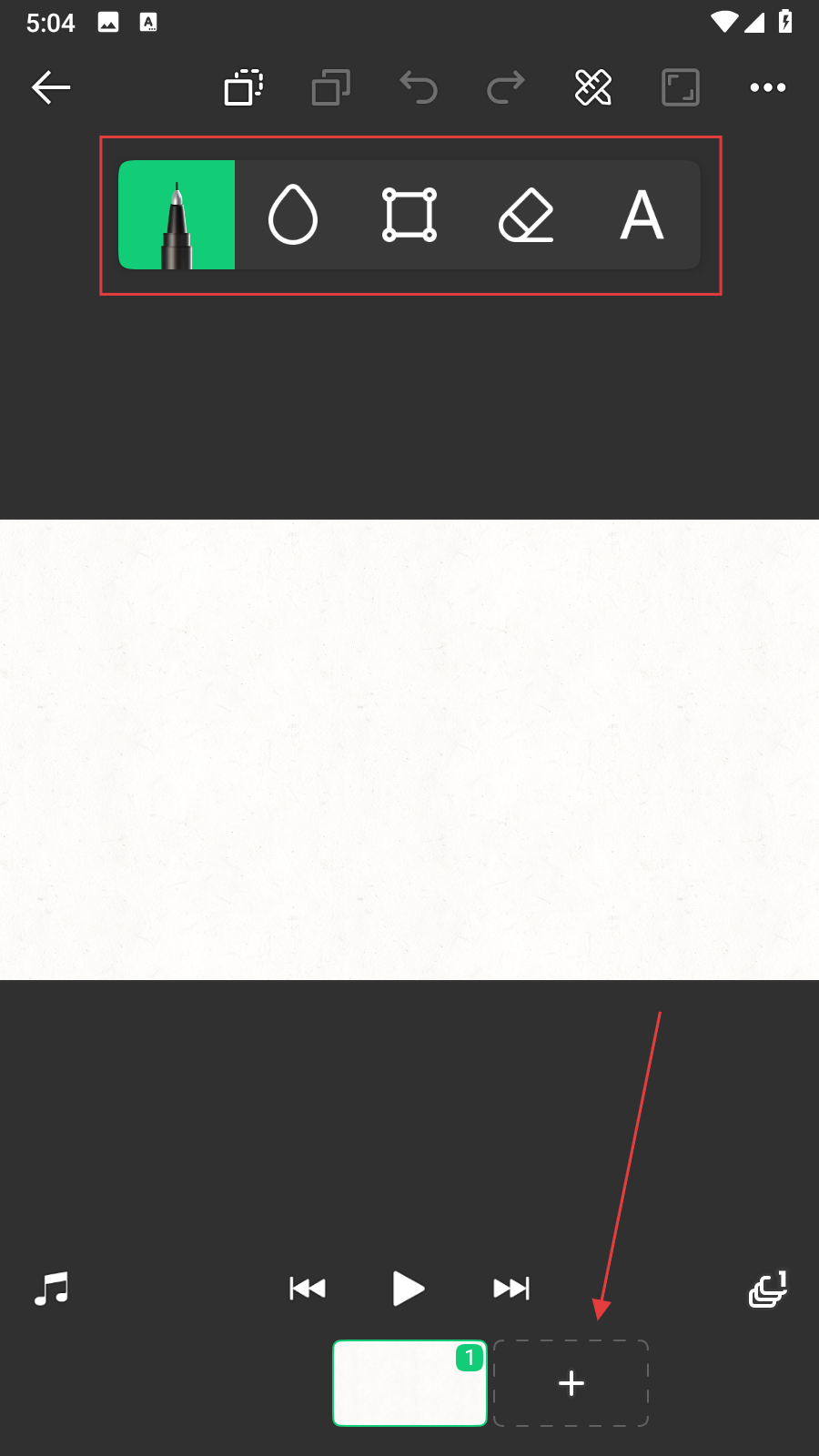 3、进入动画编辑界面后,使用顶部工具在画布上绘制或编辑动画内容,点击底部+号添加新的动画帧。