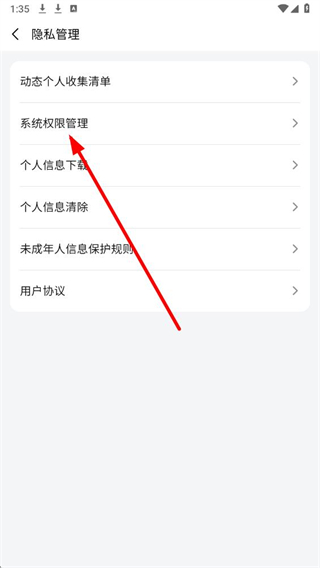3、在隐私管理页面里,找到系统权限管理选项并点击,进入权限管理页面。