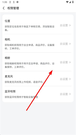 4、在权限管理页面中,选择需设置的权限,点击对应项右侧的去设置即可调整权限状态。