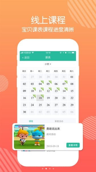 3、【线上课表功能】线上课表功能,提前了解宝宝每日活动内容,方便家长提前进行准备。