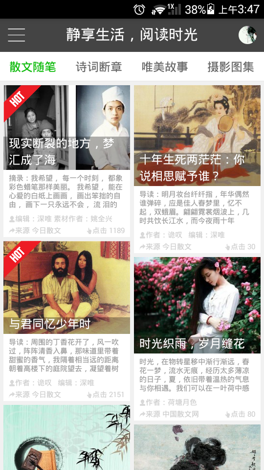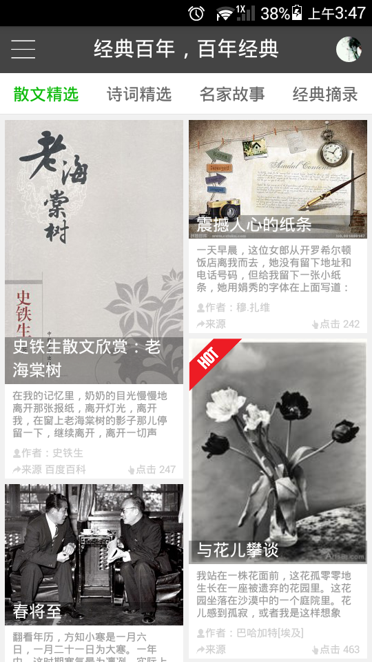 今日散文app是一款汇聚了国内外各类优秀散文、名家杰作、精华文摘的分享类资讯app,利用它,您可以随时随地填补自己的碎片化时间,用迷人的词文章句打发等车时的无聊片刻以及睡前的闲暇时光。当然,您也可以在散文社区里发帖、留言,与阅读爱好者们进行实时交流,甚至把自己的得意之文投稿给社区编辑。