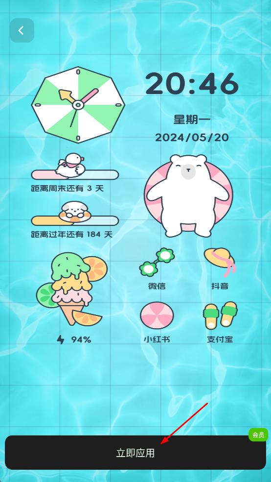 3、进入“夏日游泳池”组件详情页后,查看组件效果,然后点击页面底部“立即应用”按钮,按照提示完成后续操作,将该组件应用到桌面。