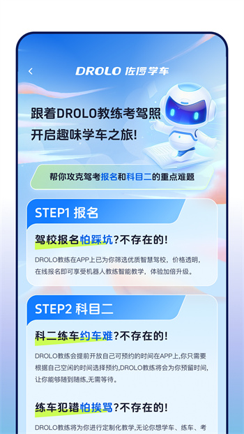1、DROLO学车为用户提供驾驶教学和驾驶技能训练,帮助用户轻松应对驾考获得考试通关成功;