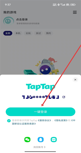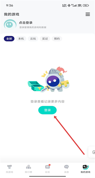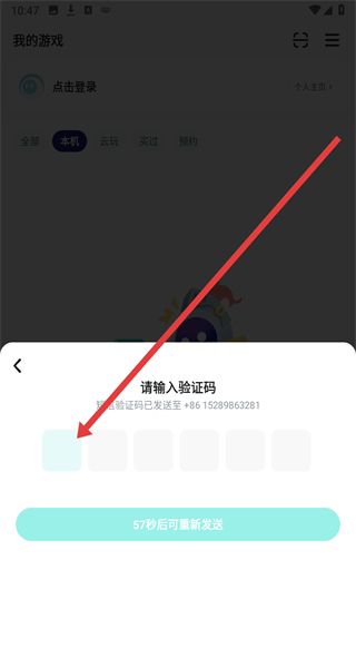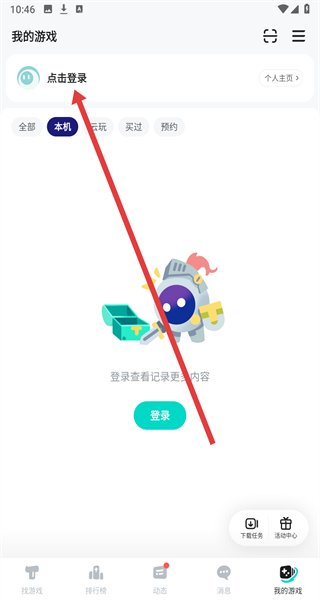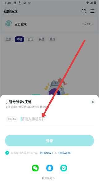 2、在“我的游戏”页面点击“点击登录”,进入手机号登录/注册界面。