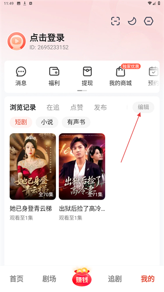 2、进入个人中心的页面内,点击浏览记录右侧编辑的按钮。