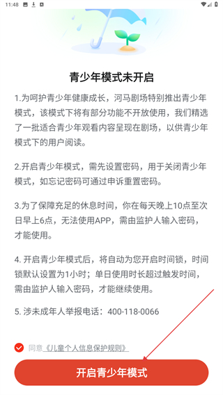 4、在该页面内,熟知后点击下方开启青少年模式即可。