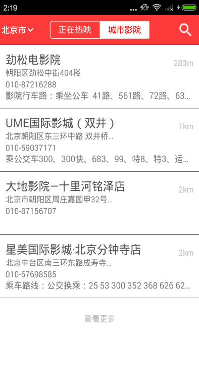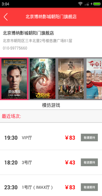 2.可以定位到当前城市来查看热映影视,附近影院信息,影院的排片信息,查看影院拍片的最新信息。