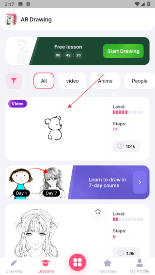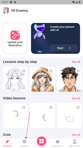 1、打开AR Drawing应用,点击底部导航栏的Lessons,进入课程选择页。