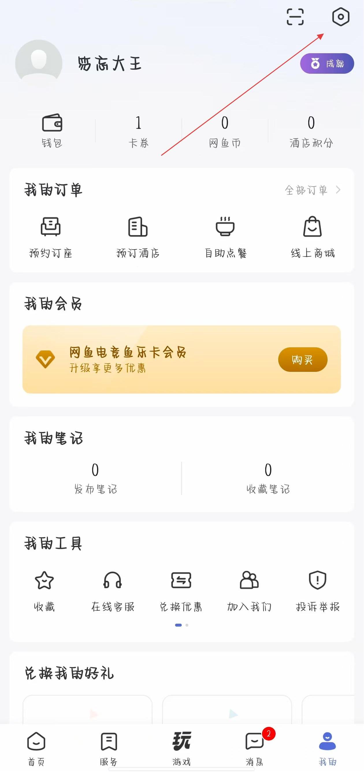 1、打开网鱼APP,进入个人页面,点击右上角设置图标,进入设置界面。