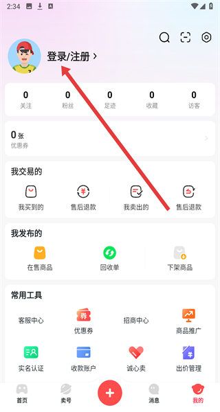 2、个人中心页面点击“登录/注册”,进入登录选择页面。