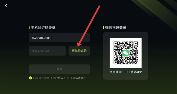 3、在进入到登录页面中,填写手机号后点击获取验证码按钮,进行登录。