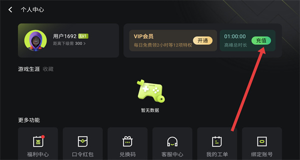 2、在进入到个人中心页面后,可以点击右侧充值按钮,进行充值操作。