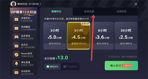 3、在充值页面中,可以点击会员充值按钮,切换充值的方式。