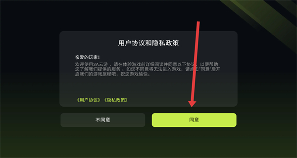 1、在打开3a云游戏后,通过点击弹窗中的同意按钮,即可进入使用。
