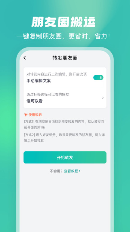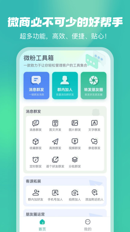 微粉工具箱软件是一款可以轻松发朋友圈进行调整的软件,并且还能看到很多优质的小功能,让自己的朋友圈变得更加有特色,如切割照片、添加特效等等,每个都有固定的拍摄模式,让照片看起来会更加的美观,平台上的其他编辑功能都是非常有效的,在日常管理的过程中也能用到,批量管理自己的粉丝群,能轻松回复平台上的粉丝的疑问,并且还能定时群发信息,避免出现忘记的情况。