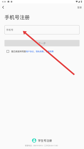 3、在跳转到注册页面后,点击输入框填写手机号后,点击进入下一步骤。